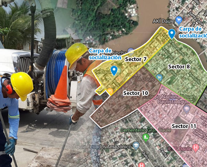 Buenas Noticias DAULE. Servicios para la la ciudad por el bicentenario, EMAPA EP en coordinación con el GAD Municipal de Daule, está realizando trabajos de limpieza Pre-invernal, con el objetivo de mejorar el funcionamiento de los sistemas de drenaje pluvial y alcantarillado sanitario de la cabecera cantonal Daule, para evitar en lo posible inundaciones que pudieran producirse durante la época invernal. El trabajo consiste en la limpieza de sumideros, tirantes, colectores, cámaras de aguas servidas, cabezales de descarga y cámaras de aguas lluvias mediante Hidrocleaner, personal técnico, cuadrillas y buzos. La limpieza se realizará por sectores, para lo cual se tomó como referencia la sectorización hidráulica del sistema de agua potable de la ciudad (19 sectores). UBICACIÓN Y FECHA DE LA MINGA La primera minga la realizaremos este sábado 11 de enero de 2020 en los siguientes sectores: